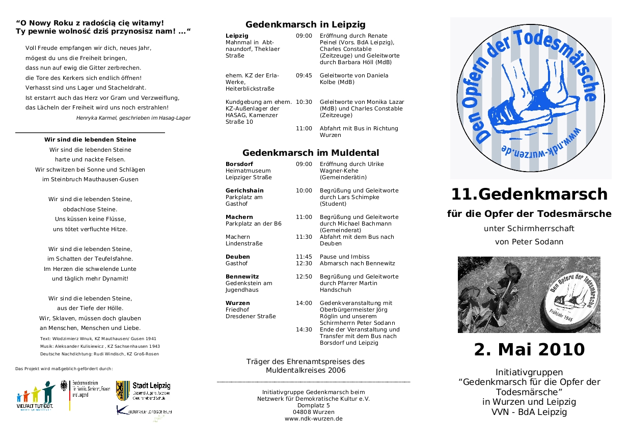 Um die Erinnerung an die vielen Opfer, deren Qualen und deren Tod aufrecht zu erhalten und um ihrer zu gedenken, findet am 2. Mai 2010 zum 11. Mal unser Gedenkmarsch statt, zu dem wir alle dem Gedanken der Veranstaltung verpflichteten Bürgerinnen und Bürger einladen.